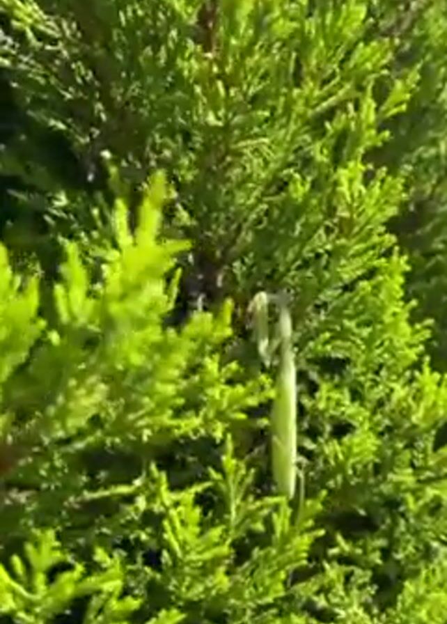 bright green praying mantis nestled within the branches of a lush, green bush. The mantis is prominently displayed in the center of the frame, blending remarkably well with its surroundings. The sunlight dapples through the bush, creating a dynamic interplay of light and shadow on the foliage and the insect's body. The camera remains relatively still, offering a clear and steady view of the mantis and its natural habitat.