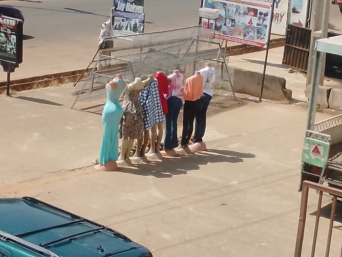 The image displays an outdoor commercial scene in Sabon Tasha, Nigeria, under bright daylight conditions. Six headless mannequins are arranged in a linear formation on a light-colored paved surface, facing a street. From left to right, they are dressed in: a light blue form-fitting dress, a patterned sleeveless dress, a blue and white checkered shirt with dark pants, a red button-up shirt with blue jeans, a light pink patterned top with dark pants, and an orange long-sleeved top with dark pants. Each mannequin stands on a round, reddish-brown base. To the left, a black rectangular sign displaying "S-CUTE" and "Jay Hairven" is mounted on a pole. Behind the mannequins, a metal display rack is visible. In the background, a large white billboard featuring various undergarments and clothing items is present. One individual, dressed in light clothing, is standing near the metal rack. A paved street occupies the left and lower portions of the frame. The roof and roof rack of a dark green vehicle are partially visible in the lower left corner. On the far right, a dark gate provides access to a building, and a pole supporting a green sign with a red triangle symbol is present. Pronounced shadows indicate direct sunlight.