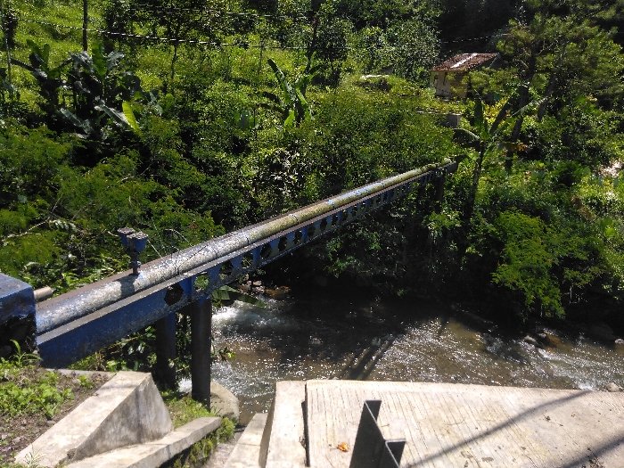 The image depicts an outdoor scene located in the city of Ottestad, Norway. A large, weathered, silver-toned pipeline, supported by a blue metal truss structure, extends diagonally across the midground over a turbulent river. A small, blue cylindrical component is mounted on the pipeline near its origin point on the left. The river flows from left to right beneath the structure, revealing visible rocks and whitewater. In the foreground, concrete steps descend on the left, partially overgrown with moss, while a flat concrete platform occupies the lower right, featuring a dark, L-shaped metal bracket. The surrounding landscape is densely covered in lush green vegetation, including numerous trees and broad-leafed plants. In the upper right background, a small, light-colored building with a red tile roof is partially visible through the foliage. The scene is brightly illuminated by direct sunlight, causing reflections on the water. No human figures are present.