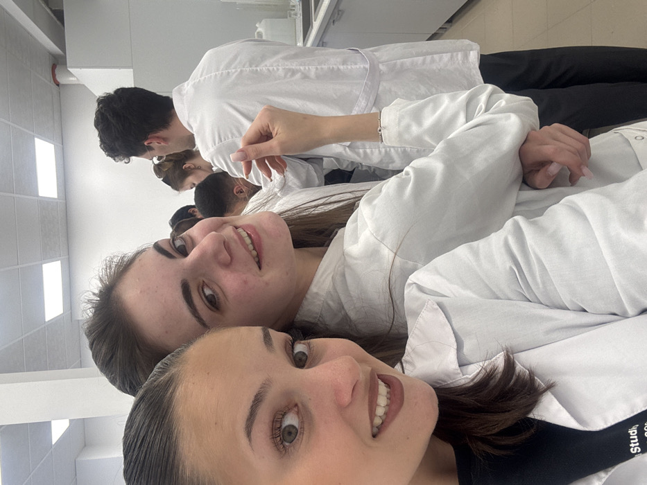The image displays an interior scene within a laboratory or classroom setting, likely part of an educational institution in Sofia, Bulgaria. In the foreground, two young women are posing for a photograph. The woman on the left, partially visible, has dark hair, wears a black top under a white lab coat, and looks directly at the camera with a subtle smile. The woman in the center-right, also wearing a white lab coat, has long dark hair and smiles broadly at the camera; her right hand, adorned with light pink manicured nails and a silver bracelet, is raised near her face. In the mid-ground and background, several other individuals, uniformly dressed in white lab coats, are present. A young man with dark, curly hair is visible from behind on the far right. The environment features white walls and a grid ceiling with recessed square fluorescent light panels providing bright illumination. Along the right side, a laboratory bench with a stainless steel sink, large white plastic containers (jerrycans), and various pieces of glassware are visible. The overall scene suggests a practical session or class taking place within a clean, modern laboratory environment.