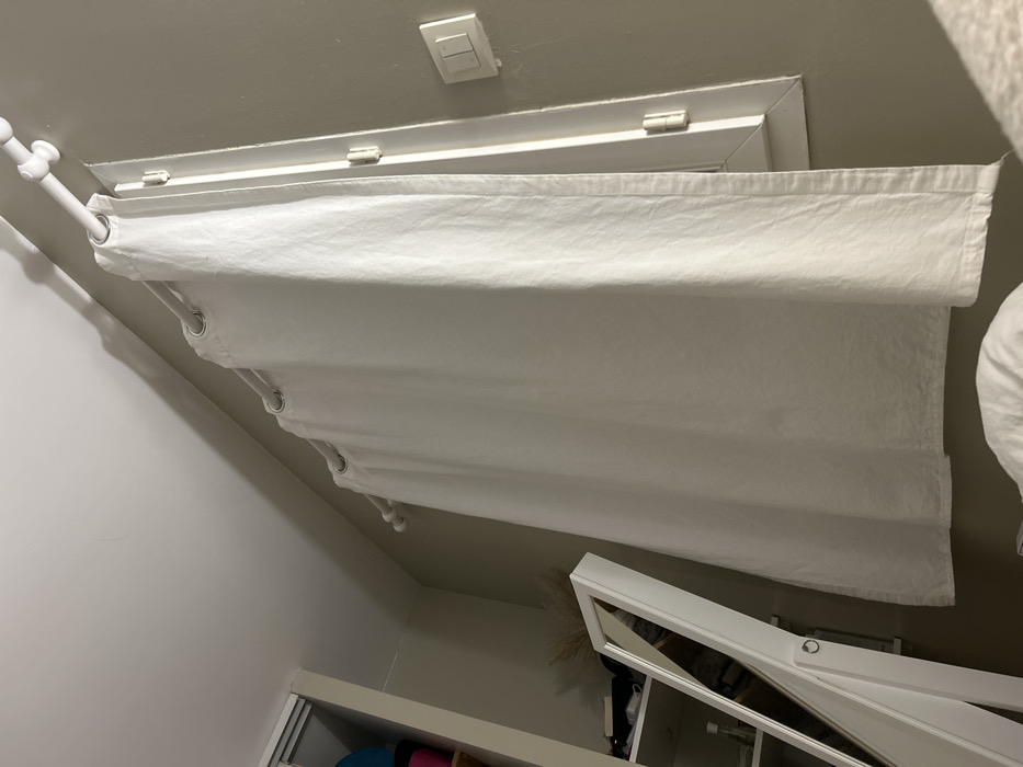 A close-up captures a white curtain hanging from a rod attached to a ceiling alcove