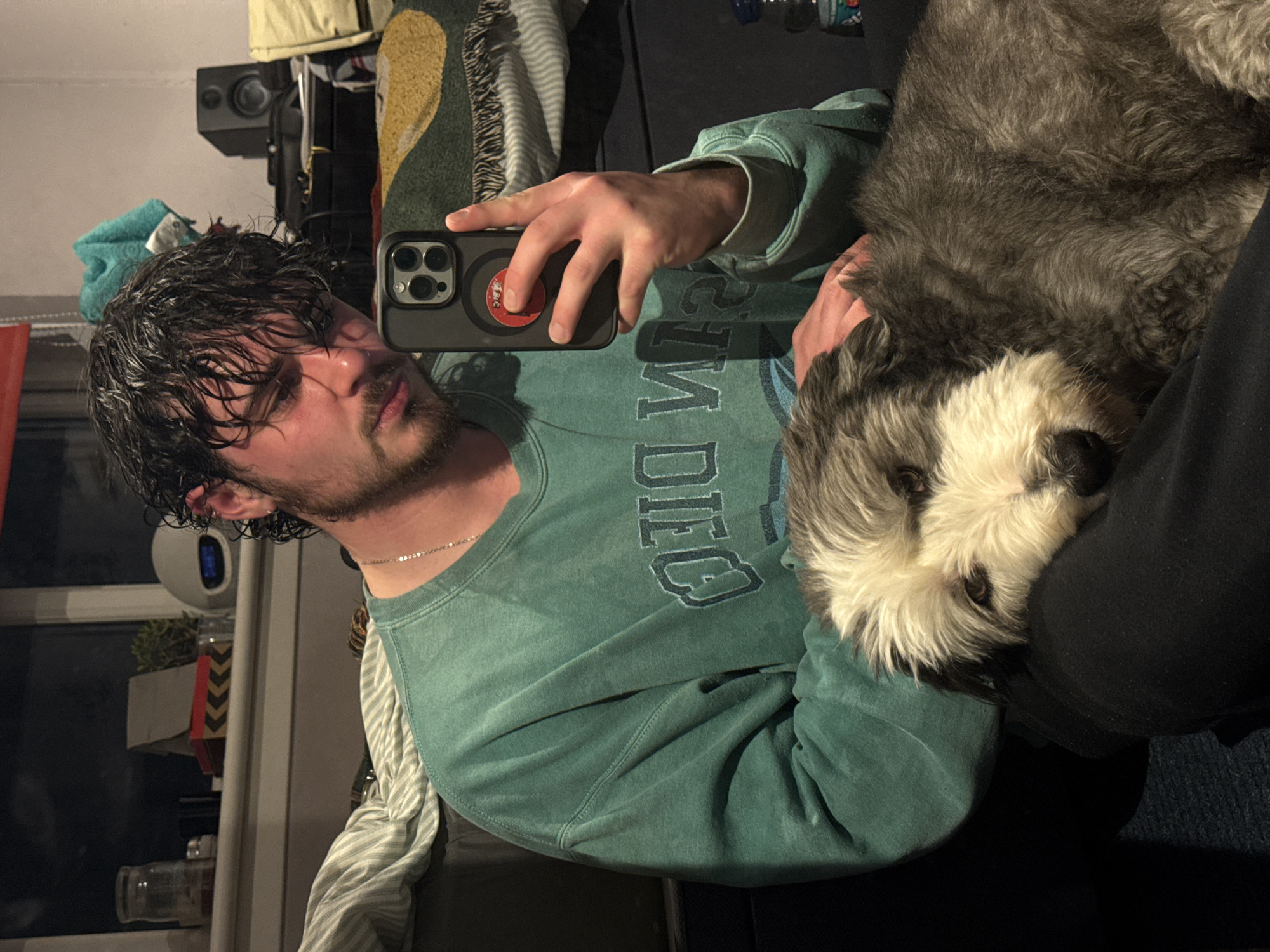 A man is taking a selfie with his dog. The man has wet, dark, curly hair, a beard, and is wearing a light green sweatshirt. He is holding a black iPhone with a red pop socket on the back. The dog is gray and white, with long fur over its eyes. The dog is lying on the man's lap. The background includes a speaker, a blanket, a bottle of water, and other household items. The location is Unknown, Unknown.