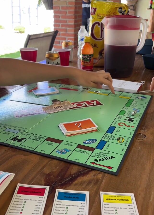 A close-up shot focuses on a Monopoly game in progress on a wooden table. Two people's hands can be seen moving playing pieces across the board. Multiple property cards are displayed in front of the board: Avenida Indiana, Plaza Park, and Avenida Venthor. A bag of Sabritas chips, a Modelo beer can, a bottle of Jumex, and a pitcher of a red liquid are visible in the background. A person in a black shirt stands in the background as well. The scene appears to be set on an outdoor patio with red brick pillars.