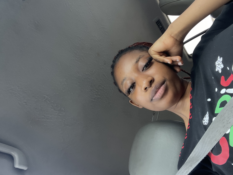A young Black female is seated within the interior of a vehicle in Lagos, Nigeria, facing the camera with a neutral expression. She has dark skin, full lips, and long, dark eyelashes. Her hair is styled in thin braids, with reddish-brown streaks visible on the right side of her head. She wears a black t-shirt featuring a festive design with white snowflakes and red and green letters. A gray seatbelt diagonally crosses her chest and left shoulder. Her left hand, adorned with light-colored nail polish, rests against her left cheek and jawline. The vehicle's interior includes a light gray headliner and a matching headrest or seat upholstery visible behind her. A blurred, light-toned outdoor environment is visible through a window on the vehicle's right side (viewer's left). The lighting is soft and ambient.