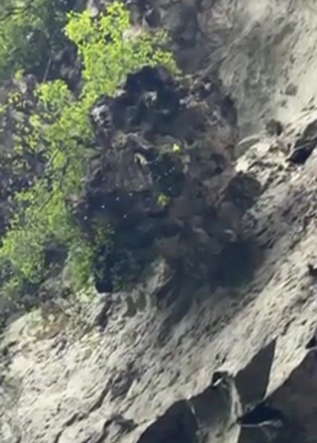 low-angle shot of a rock face, possibly within a cave or canyon. The rock is predominantly gray with a rough, textured surface. Green foliage is visible at the top of the frame and on a rocky outcrop, suggesting vegetation growth on the rock face. Small, white dots are scattered in the air, possibly insects or dust particles caught in the light. The light is diffused, creating a slightly dim atmosphere.