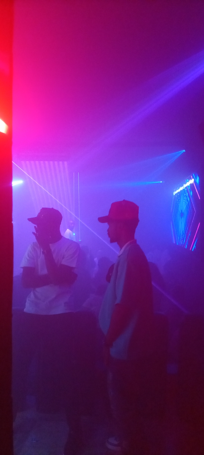Two people stand in a dimly lit, crowded space under vibrant pink and purple lighting. Both wear caps, one donned in white, the other in red. The scene is further illuminated by beams of laser light traversing the space, with a screen visible in the background displaying abstract patterns. The overall atmosphere suggests a nightclub or event setting.