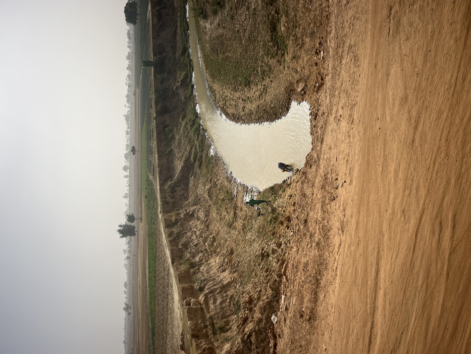 A muddy landscape features a curved waterway filled with tan-colored water. A dark figure stands at the water's edge, and a green object lies nearby on the bank. The right side of the image shows a dirt path. On the left, cultivated fields stretch into the distance under a hazy sky. The horizon is obscured by the dense atmosphere.
