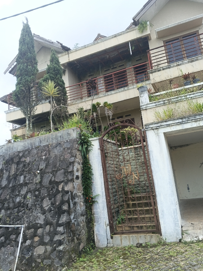 A multi-story residential building, painted in a beige hue, stands on elevated terrain in Bagochen Boolingpang Ueling, Bhutan, viewed from a lower vantage point under an overcast sky. The building features multiple balconies with reddish-brown metal railings and brown-framed windows and doors. The top-right balcony displays potted plants and dry vegetation within planter boxes. The building has a pitched roof with dark shingles, showing some visible growth of ferns. In the foreground, a tall, dark grey stone retaining wall occupies the left, exhibiting visible mortar and some dark staining. To the right of the wall, a weathered and rusted wrought iron gate, adorned with the intertwined letters "JMN" in its center, stands partially open, revealing a set of concrete stairs leading upwards. The ground immediately in front of the gate and wall is covered with patchy green moss and dirt. Vegetation is abundant: two tall, slender coniferous trees dominate the left side, partially obscuring the building. A lighter-colored plant with spiky leaves is situated between them. Various shrubs, overgrown plants, and vines are scattered across the property, including a vine with small orange flowers growing vertically on the white concrete post adjacent to the gate. Thin, dark utility lines are visible against the pale, overcast sky. No individuals are present in the scene.