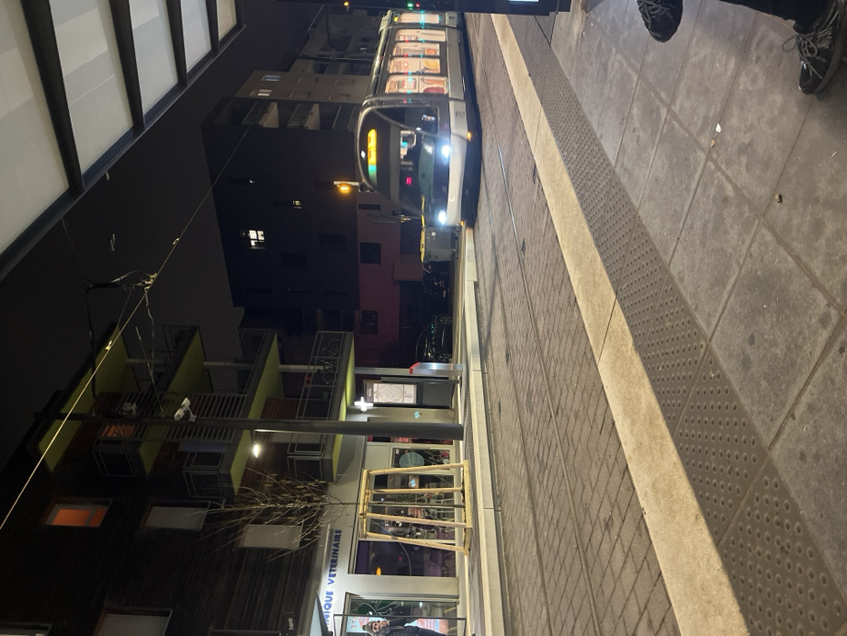 A tram approaches a platform at night. The platform has textured paving and leads to a modern building with a brightly lit vet clinic. A multi-story building with colorful balconies is reflected in the clinic windows. Streetlights illuminate the scene, and power lines are visible overhead against the dark sky. Part of a person and their shoes are visible in the upper right corner.