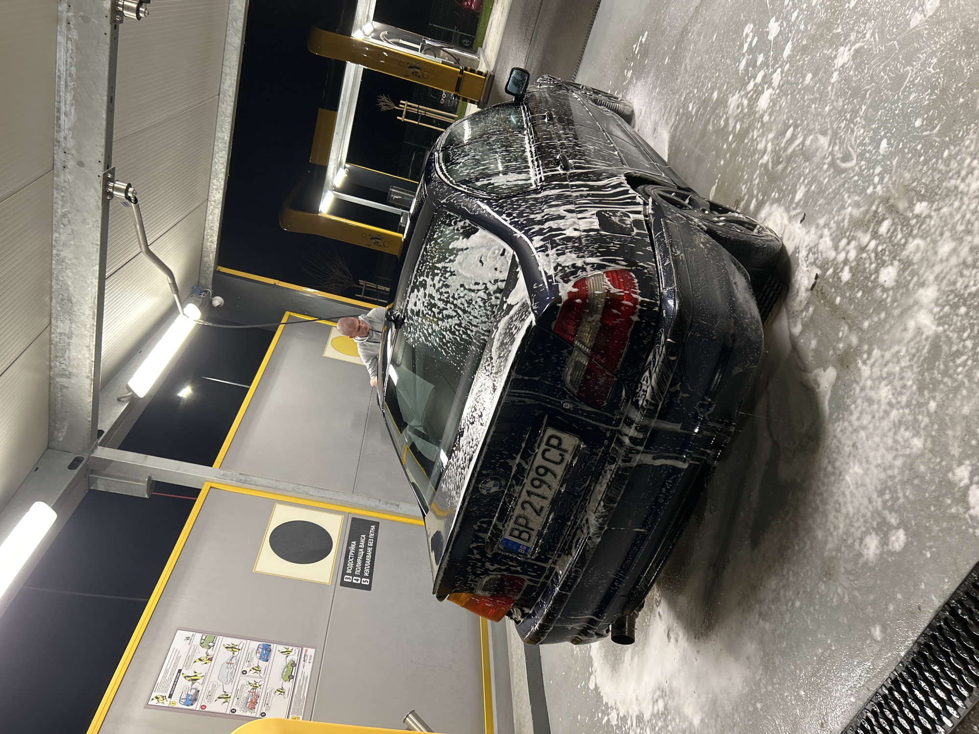 The image depicts a dark blue BMW sedan being washed at a self-service car wash. The car is heavily covered in soap suds. A person is visible near the front of the car, possibly operating the washing equipment. The car's license plate reads "BP 2199 CP," which is a Bulgarian license plate. The location appears to be a modern car wash facility with overhead lighting and instructions posted on the wall. There is a drain on the floor. The scene likely takes place in Vratsa, Bulgaria, as indicated by the license plate's region code "BP," which corresponds to Vratsa.
