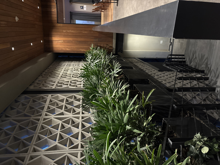 An architectural shot taken from a low angle, showing a building with a patterned facade made of repeating geometric shapes. Lush green plants line the wall, contrasting with the concrete and wood textures. A set of black stairs with railing runs along the right side of the frame, leading upwards. The lighting is dim, highlighting the textures and creating a sense of depth.