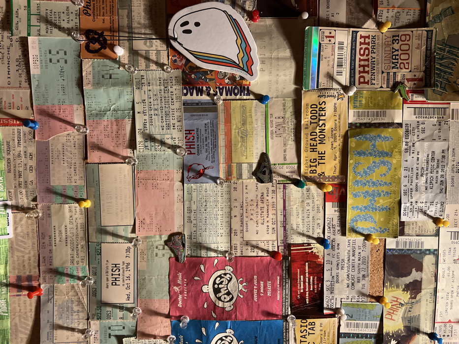 - "This image displays a dense, vertical close-up view of approximately 50-60 concert tickets, predominantly featuring the band Phish, meticulously pinned onto a light brown, fibrous surface, consistent with a corkboard" by FM-q2Ym22, licensed under CC BY 4.0
