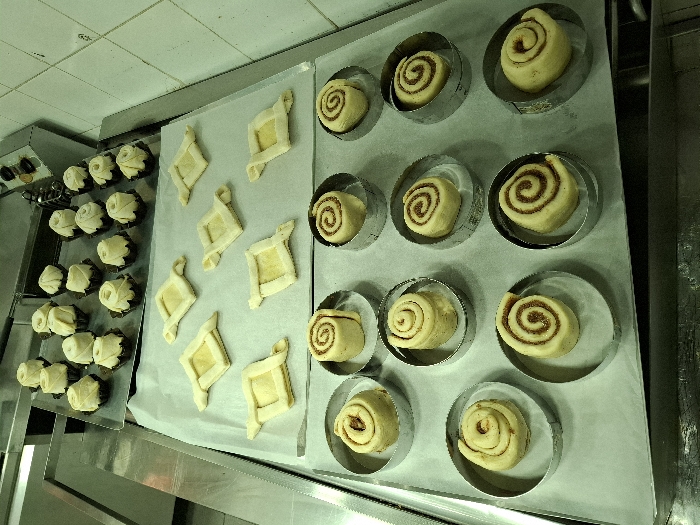 The image displays a static scene within a commercial kitchen environment located in Bnei Dror, Israel. Various unbaked pastry items are arranged on baking sheets atop stainless steel preparation surfaces. In the foreground, a baking sheet covered with parchment paper holds 11-12 individual unbaked spiral pastries, each contained within a circular metal ring mold. These pastries exhibit a light-colored dough with a distinct darker brown, spiraled filling visible from above. Immediately behind these, on another baking sheet also lined with parchment paper, are 8-10 unbaked square pastries. Each square pastry consists of a flat dough base with its four corners folded inward, creating a smaller, slightly raised central square outline. In the upper background, positioned on a metal tray, are approximately 18-20 small, unbaked dough pieces, each nestled within a dark brown fluted paper liner. These pieces appear to be gathered or folded, forming a textured, rosette-like shape. The environment includes reflective stainless steel countertops and a white tiled wall visible on the right side of the frame. An industrial kitchen appliance, possibly an oven or control panel, with dark circular knobs, is partially visible in the upper right background. No individuals are present, and no actions are actively depicted.