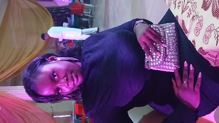 A female subject, likely in her twenties or thirties, is seated in the foreground, facing the camera. She has dark skin, dark hair, and wears a black long-sleeved textured garment. She has long, silver-toned dangle earrings and multiple rings on her fingers; her fingernails feature white tips with black accents. On her lap, she holds a silver-toned, rhinestone-studded clutch bag with her right hand, while her left hand rests beside it on her upper thigh. She is seated at a table covered with a light-colored tablecloth patterned with brown and reddish floral/leaf motifs. In the mid-ground, a male subject in a white traditional garment stands with his back partially turned, facing towards the right of the frame. The background consists of draped yellow/gold fabric against a wall, indicating event decor. Multiple colored chairs (red, green, blue) are scattered in the background. The scene is illuminated by strong purple and pink ambient lighting, casting a distinct hue over the subjects and environment. The location is an indoor event venue in Unknown, Unknown.