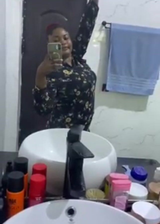 A person is taking a selfie in a bathroom mirror. The person has their left arm raised high in the air at the beginning of the video, then lowers it. They are wearing a floral print shirt. A white sink is in the foreground, with various toiletries around it. A blue towel hangs on a rack on the wall. The bathroom has a dark door and light-colored tiled walls.
