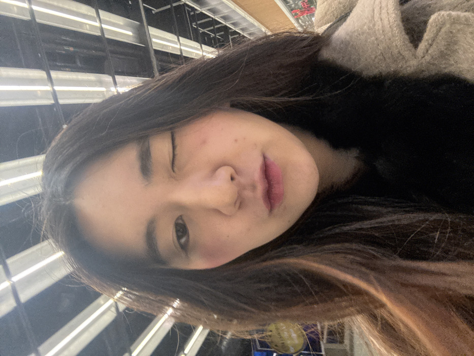 A young woman poses for a selfie, tilting her head. She winks with her right eye, and her lips are slightly puckered. The woman has dark brown hair and wears a beige coat with a black collar. The background is a bright, blurred space, possibly a retail environment with rows of lights or shelves overhead.