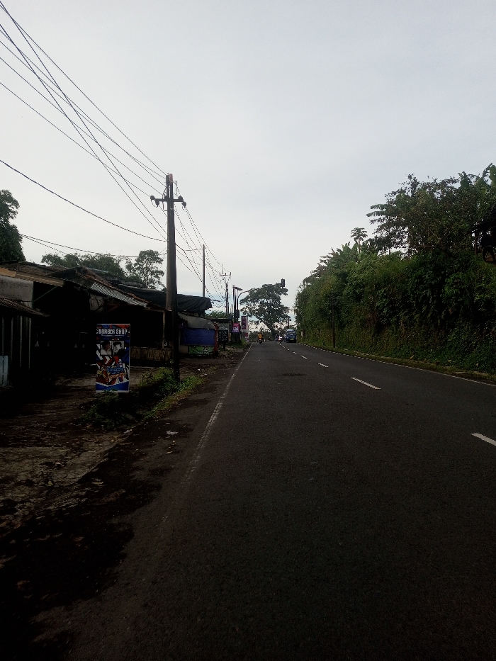 The image displays a paved road in San Pya, Myanmar, observed from a low-angle perspective under an overcast grey sky. The asphalt road, appearing dark and possibly damp, extends into the distance, marked by two white dashed center lines and a solid white line on its right edge. Several vehicles are distantly visible further down the road, their specific types and occupants indistinct. On the left side, a dirt shoulder borders the road, leading to a prominent wooden utility pole supporting numerous overhead electrical wires that crisscross the frame. Beyond this pole, a series of dark, single-story structures with corrugated metal roofs line the roadside. A vertical banner advertising a "BARBER SHOP," featuring graphic images of hairstyles and pricing details, is affixed near one of these buildings. Further along the left, additional structures are partially visible, some covered with blue tarpaulins, with sparse trees behind them. The right side of the road is defined by a dense, verdant wall of vegetation, comprising various bushes and vines, growing along an embankment or retaining wall. This green foliage extends upwards and into the distance, with more trees partially visible beyond. No discernible individuals or specific actions are present in the immediate foreground or mid-ground.