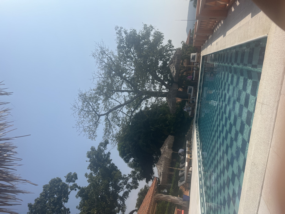 A serene outdoor scene presents a checkered swimming pool on the right, reflecting the sky. Adjacent to the pool, lounge chairs are shaded by a thatched roof structure. Tall trees, some bare-branched, dominate the landscape, contrasting against the clear blue sky. A wooden fence lines the upper edge of the frame, suggesting a property border.