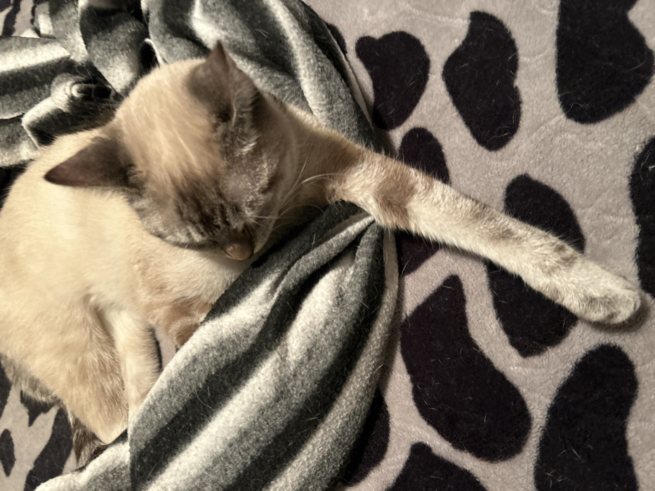 - "A light tan Siamese cat is curled up asleep on a gray blanket with black and white patterns" by FM-ZvYlO2, licensed under CC BY 4.0