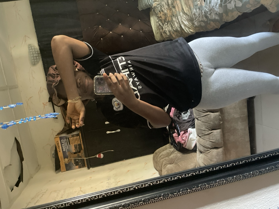 A person is depicted taking a mirror selfie in an indoor setting within the city of Ajaokuta, Nigeria. The individual, seen from the waist up, wears a black short-sleeved t-shirt featuring "ETIHAD AIRWAYS" text and a Manchester City FC crest. Light grey ribbed leggings are worn on the lower body, with a thin, beaded waist chain visible. A brown satin bonnet covers their head. The person holds a smartphone, visible with a glitter-decorated case, in their left hand, angling it towards a large, ornate-framed mirror. Their right forearm is raised, with the hand covering the upper part of their face. The reflection in the mirror reveals a room with light-colored walls and a damaged ceiling showing a crack. A string of blue, transparent beads hangs from above. To the left, a light brown, tufted armchair or sofa is visible, draped with a pile of various clothes, including pink, black, and white fabrics. Behind this, a dark cupboard or wardrobe is partially visible, with a cardboard box (labeled "CORDLESS" and "CFLSS00") and a small red-and-white striped object hanging from it. To the right of the person, a dark brown or black headboard with a tufted or diamond-stitched design is visible, suggesting a bed. The overall scene indicates a domestic indoor environment.