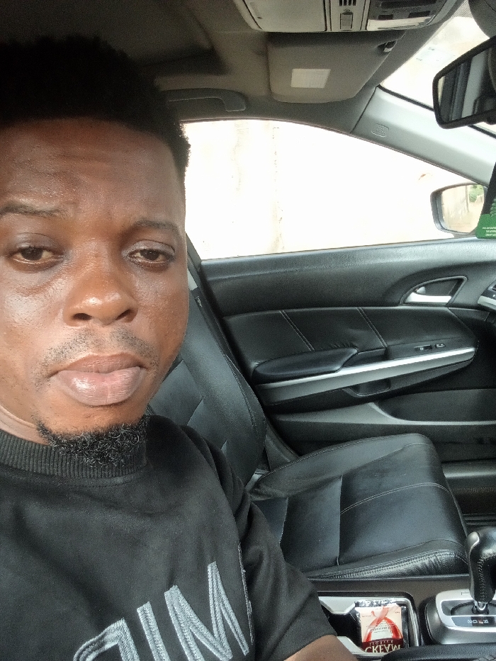 The image displays an adult male seated in the driver's position within a vehicle, located in Umudioka, Nigeria