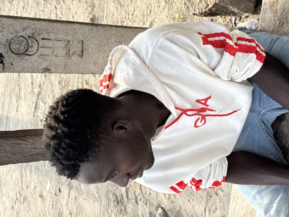 A young Black male with short, dark, curly hair is depicted from the chest up, in profile, gazing left. He is wearing an off-white hooded sweatshirt with "GIA" printed in red on the chest and red triple-stripe patterns on the sleeves; a red drawstring is visible at the neck. Light blue denim jeans are partially visible. The individual is seated or crouched. To the left is a rough wooden beam. To the right, a weathered concrete post is visible, bearing the vertical inscription "MEECO". The ground is sandy or dirt-like, light brown in color, with faint impressions. The scene is outdoors and brightly lit. This scene is located in Badore, Nigeria.