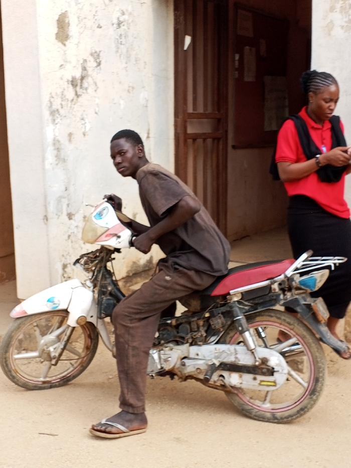 The image depicts a candid street scene in Bauchi, Nigeria. In the foreground, a young male of African descent is seated on a white and black motorcycle with a red seat. He wears a dark brown t-shirt, dark brown trousers, and white and brown flip-flops, looking directly at the camera. The motorcycle appears worn, with exposed engine components and a white front fender featuring a blue emblem and pink accents. The rear wheel has a pink rim. In the background, to the right of the male, a female of African descent stands, wearing a red polo shirt, black skirt, and a dark scarf or bag. Her dark braided hair is pulled back, and she is focused on a smartphone held in her hands. The backdrop consists of a light-colored, weathered building with visible peeling paint or plaster, and a dark brown metal door or gate. A dark board, possibly a bulletin board with papers, is affixed to the wall above the door. The ground is an unpaved, sandy surface.