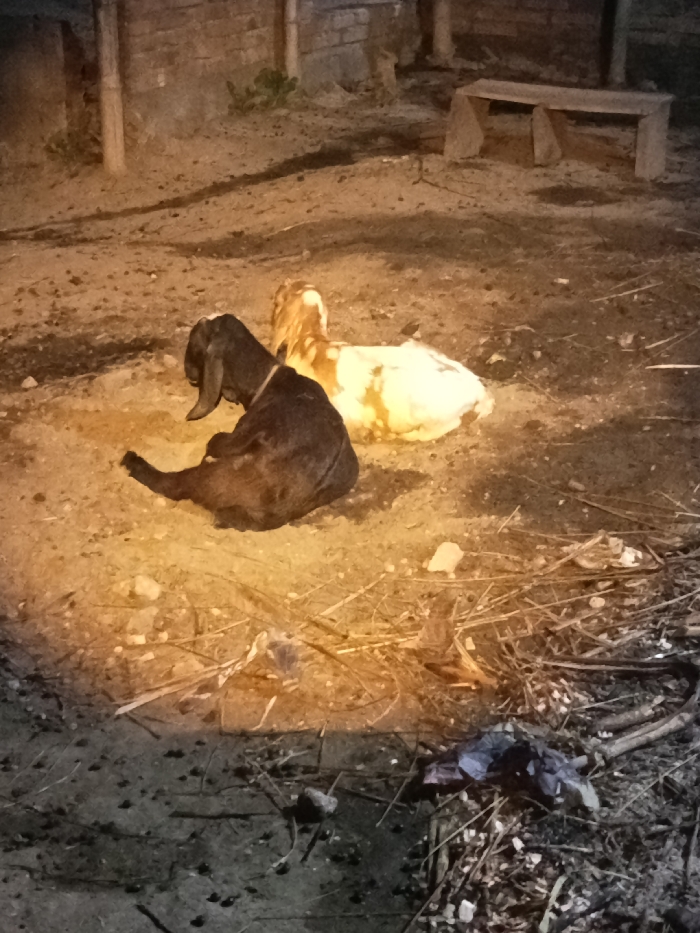 The scene, located in Lhokseumawe, Indonesia, depicts an outdoor area at night or in low light, illuminated by a warm, artificial light source. Two goats are resting on dry, uneven dirt ground. In the foreground-left, a dark brown or black goat with long, floppy ears and a light-colored collar is lying curled on the ground, facing partially left. Behind it and to the right, a second goat, primarily white with brown or tan markings, is also lying down, facing away from the viewer with its head turned left. The ground is scattered with small rocks, dry twigs, and other debris. In the background, a rustic wooden bench with three supports is visible to the right. Further back, a dark wooden wall or fence and several vertical wooden posts are present, along with a small patch of green vegetation. Shadows are cast by the goats and other objects, indicating a low-angle light source. No human subjects are visible.