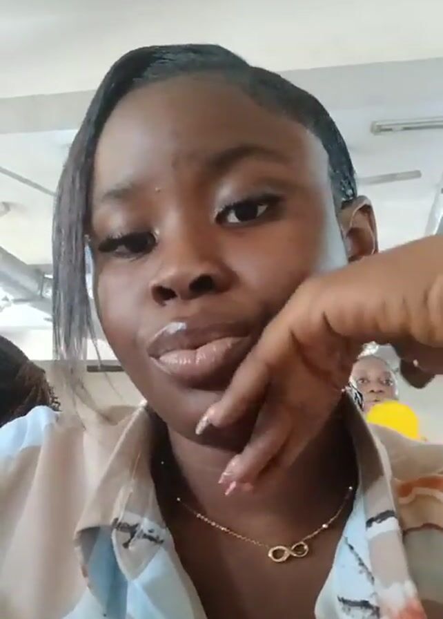 A young woman with dark skin is looking at the camera and posing. She is wearing a patterned shirt and a gold necklace with an infinity symbol pendant. Her hair is styled back, and she is wearing earrings. She rests her face on her hand. The background appears to be an indoor space with other people present. There are ceiling fans visible.
