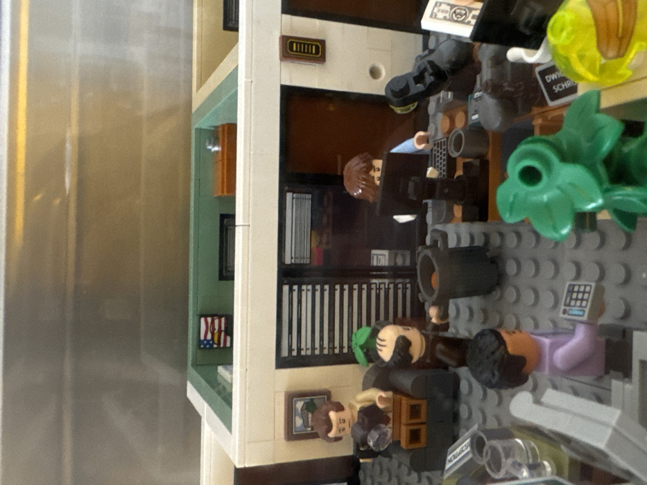 A detailed Lego brick-built diorama depicts an office interior, observed from a slightly elevated perspective