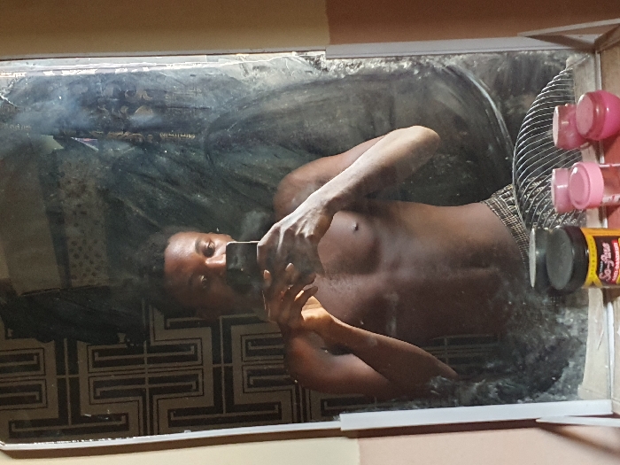 The image depicts an indoor mirror selfie of an adult male with dark skin and short, dark hair