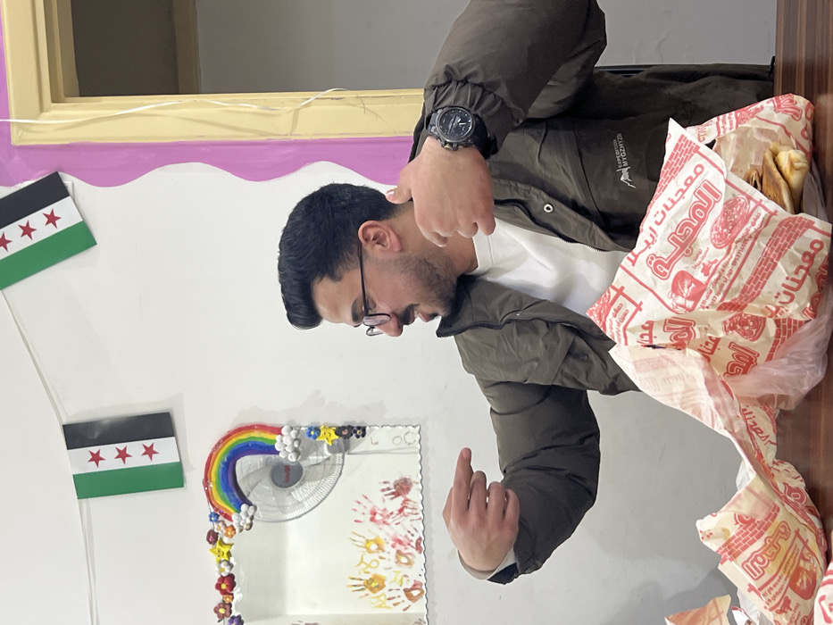 An adult male is photographed indoors, seated at a wooden table in Al-Qanawat Municipality, Syria