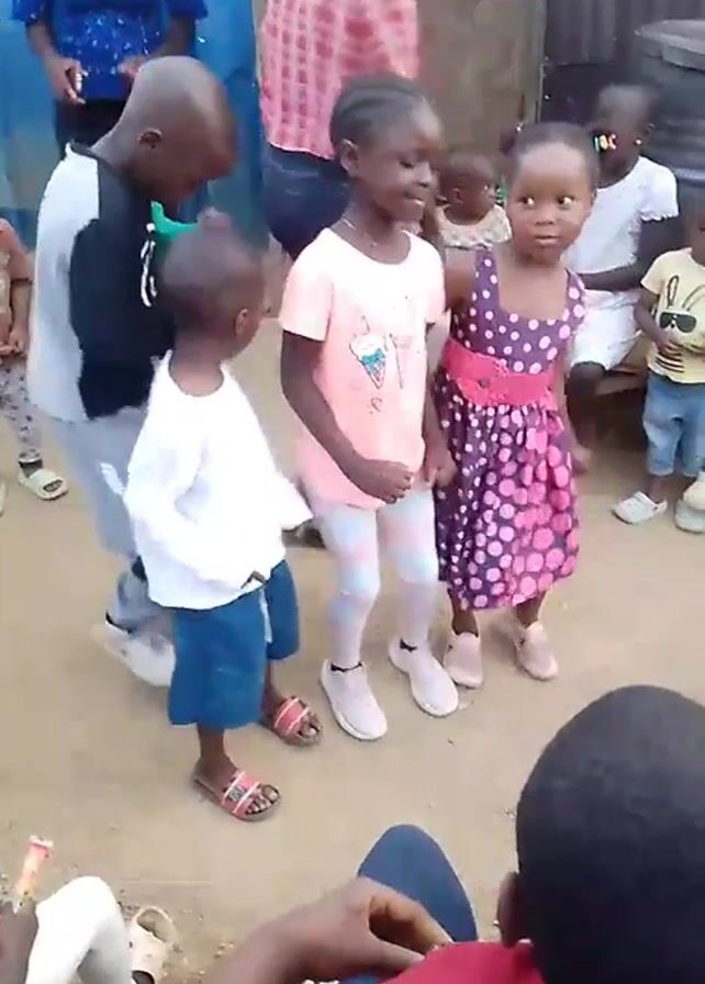 Several young children, around five years old, are dancing in an outdoor setting. They are of African descent. Some adults stand behind the group, observing. The children are wearing colorful clothes: one girl has on a purple polka dot dress, another is in a peach-colored shirt and striped leggings. A boy next to her is in a white shirt and blue shorts. The ground is a dusty tan color, and there is a shed structure behind them. A person wearing a red shirt with white writing sits in the foreground, facing the dancers.