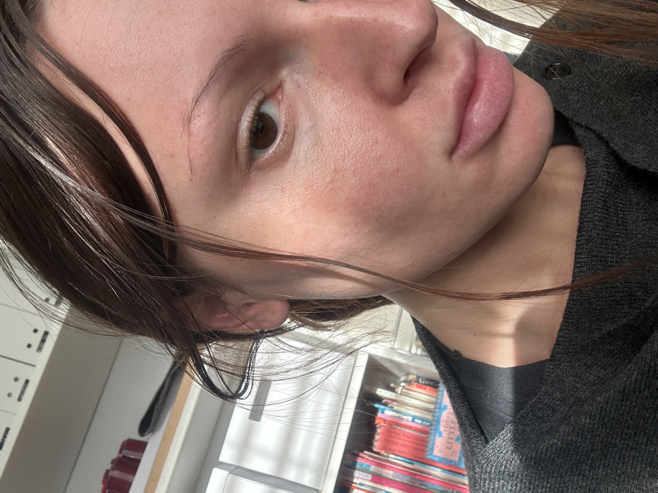 A close-up, angled portrait of an individual, likely female, is captured indoors in the city of Wealden, United Kingdom. The subject's dark brown hair is styled with loose strands framing the left side of the face. The visible right side of the face features a fair complexion, a dark brown iris in the open eye, a prominent nose, and full, light pink lips. The skin exhibits visible pores and some areas of redness. The subject wears a dark grey knitted garment, possibly a sweater, with a dark button visible on the collar area on the right side. Strong directional light illuminates the left side of the subject's face and shoulder, casting shadows on the right. In the background, to the left of the subject, a white shelving unit is visible. The uppermost shelf holds several small red containers and a single dark, elongated object. Above this shelf, affixed to a white wall, are three identical minimalist diagrams, each consisting of two dots for eyes and a horizontal line for a mouth. Below the top shelf, a lower shelf is partially visible, containing numerous books or binders with colorful spines, predominantly red, blue, and white. Some spines display partially legible text, including "LITTLE [text]". The overall environment suggests an interior setting with organized storage.