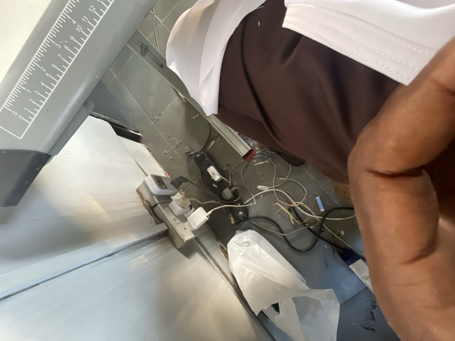 The image depicts an indoor corner of a room, likely a utility or waiting area, located in Abuja, Nigeria. A light-colored wall, exhibiting vertical dirt and moisture streaks, features a low-mounted two-gang electrical outlet. Connected to this outlet is a white voltage stabilizer with a green indicator light and a red digital display, into which a black plug is inserted. The adjacent socket contains a white multi-adapter, which in turn accommodates two white USB power adapters. Below the outlet, the grey tiled floor is covered with a chaotic arrangement of numerous tangled white and black electrical cables, power strips, a small black speaker, a blue cylindrical object, and a crumpled white plastic bag. A large, grey mechanical height measuring scale, marked with white increments from 0 to 13, is partially visible on the right side of the frame, extending vertically from the floor. In the foreground, occupying the bottom right, a dark-skinned individual is partially visible. The person is wearing a dark brown garment, possibly a thobe or kaftan, with a white fabric covering draped over the head or shoulder. Their left hand is prominently displayed in the extreme foreground.