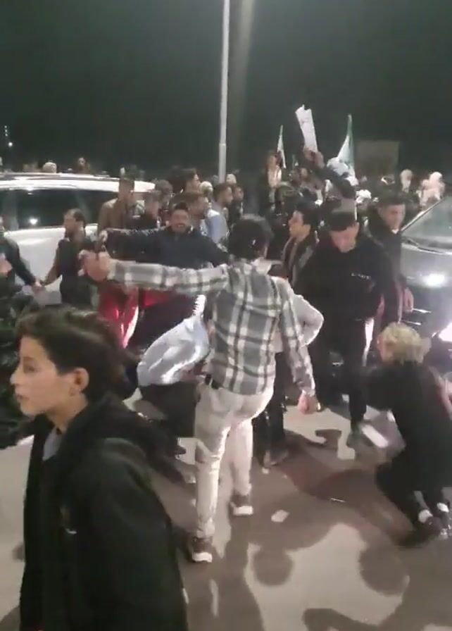 A large group of people, mostly men, are gathered outside at night, seemingly celebrating or protesting. Many are holding hands and moving in a circle, while others are standing around observing. Some individuals hold what appear to be flags, and a white car is visible in the background. The scene is lit by streetlights, casting shadows on the ground.