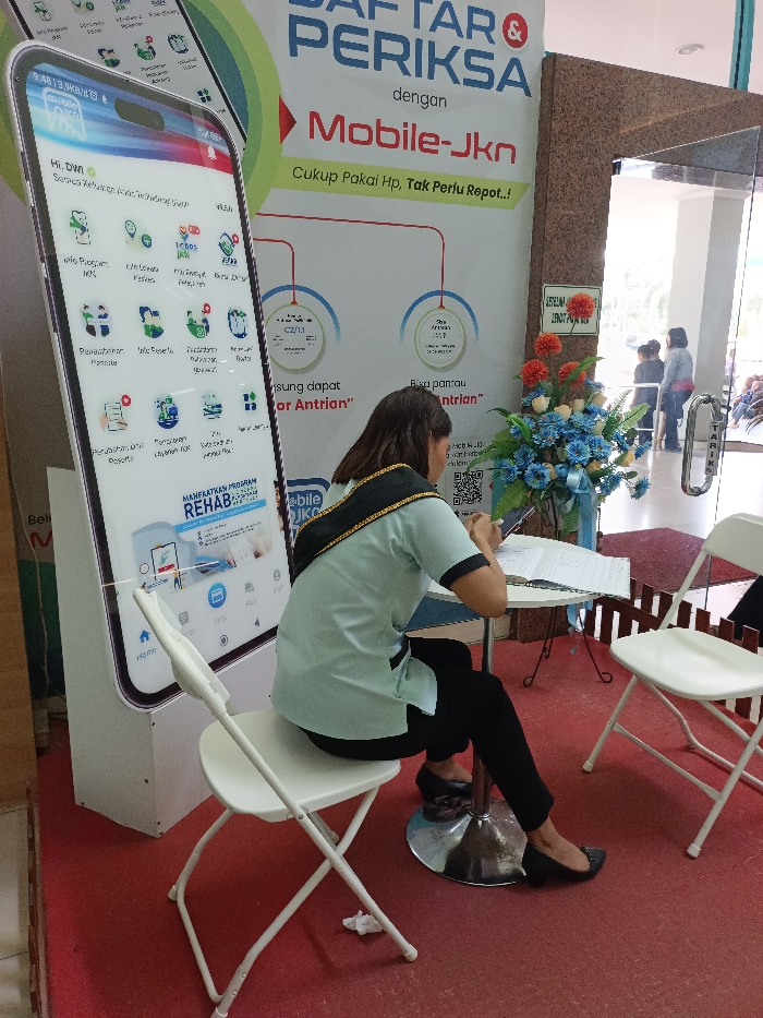 In a public interior space within Margorejo, Indonesia, a woman is seated at a small, round white table, actively writing on documents. She wears a light green short-sleeved uniform top with a dark sash, black trousers, and dark low-heeled shoes, occupying a white folding chair. An identical empty white folding chair is positioned to her right. To her left stands a large, white smartphone-shaped display promoting the "Mobile-Jkn" application, showing various app icons and text such as "DAFTAR & PERIKSA dengan Mobile-Jkn" (Register & Check with Mobile-Jkn). Behind this display and the woman, a large banner reiterates the "Mobile-Jkn" promotion. To the woman's right, an artificial floral arrangement in blue and orange rests in a blue vase. The floor in the foreground is covered with a red carpet or mat. In the background, beyond a glass door framed by light brown panels, several blurred individuals are visible in a brightly lit area, suggesting an entrance or waiting area. A sticker reading "TARIK" (Pull) is affixed to the glass door.