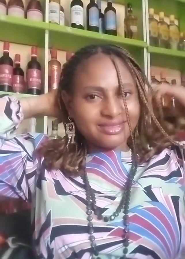 A woman poses for the camera. She has braided brown hair and wears a colorful blouse and a black bead necklace. She is standing in front of a shelf full of bottles. She puts her hands on her head and behind her neck, smiling as she looks at the camera.