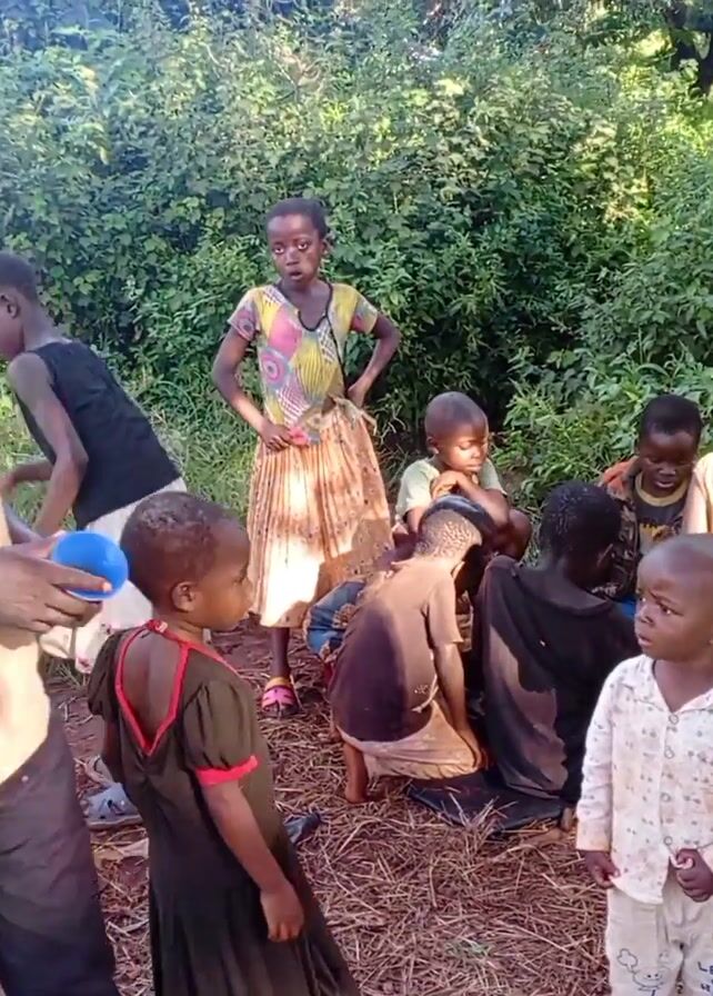 group of approximately 13 children standing outside in a grassy area near some trees. A man in a tan polo shirt with writing on the back is interacting with them, handing out what appears to be small items in blue containers. The children are of varying ages and are dressed in casual clothes. Some are standing, others are sitting on the ground. The background includes dense green vegetation and a dirt ground. The man appears to be the focus of attention for many of the children.