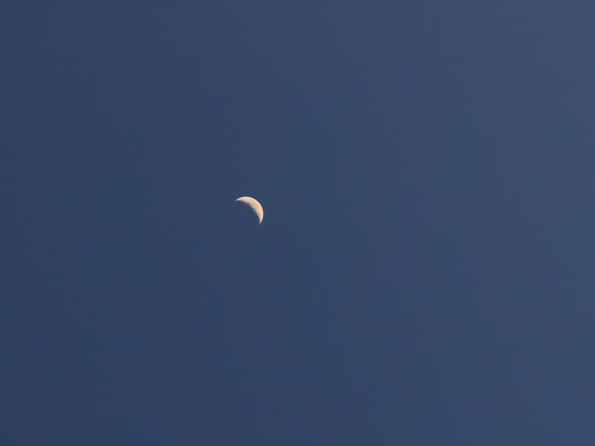 - "The image displays a clear deep blue sky, characteristic of twilight or early night conditions, with a distinct crescent moon positioned slightly above the central horizontal axis" by FM-nKrUC2, licensed under CC BY 4.0