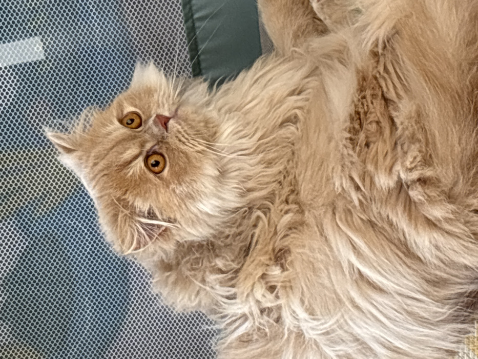 - "An orange-cream long-haired domestic cat is depicted in a close-up, upward-facing orientation" by FM-VjBKw1, licensed under CC BY 4.0