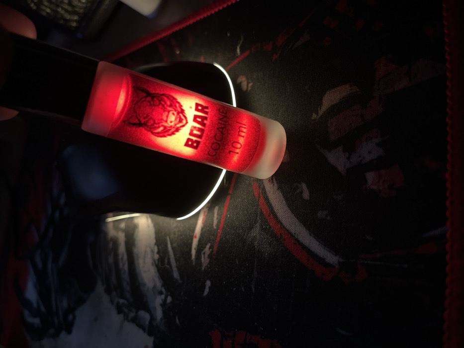 A small, clear bottle with a black cap is brightly illuminated, revealing a red liquid. The label reads "BOAR" above "COCAINE" and "10 ml". The bottle features a stylized boar's head. It is resting on a black and red patterned surface that appears to be a mousepad. Part of a black object sits in the background, partially obscured. The overall lighting in the image is low, emphasizing the glow from the bottle.