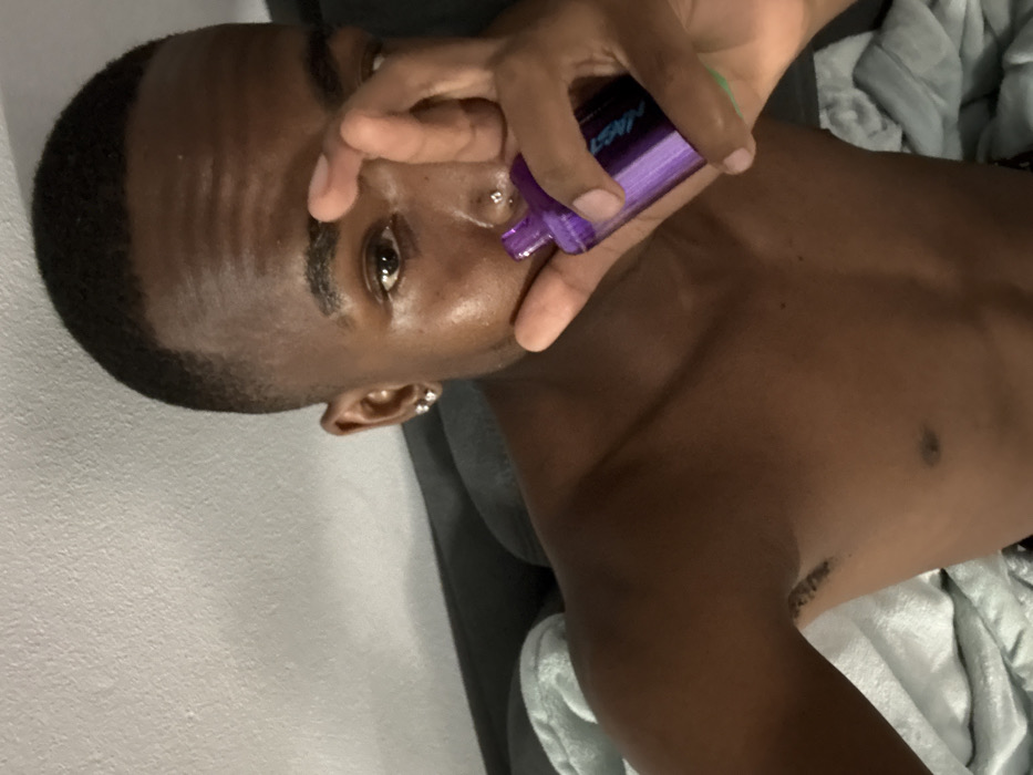 The image displays a close-up, indoor portrait of a bare-chested dark-skinned male, situated in what is identified as a private residence in Pretoria, South Africa. The subject, appearing to be an adult, has closely cropped dark hair and maintains direct eye contact with the viewer. A silver stud earring is visible in his left earlobe, and two silver stud piercings are present on the right side of his nose. His skin exhibits a noticeable sheen. The subject's left hand is raised, with fingers partially obscuring the lower half of his face, while holding a purple vaping device. The device features a light-colored logo, partially visible as "MES" or "MEST," and has a green band at its base. The background consists of a dark upholstered surface, likely a couch or bed, behind the subject's left shoulder and to his right, with a light-colored blanket or fabric object draped nearby. A plain, light-colored wall is visible in the upper left portion of the frame. The lighting suggests an interior setting.
