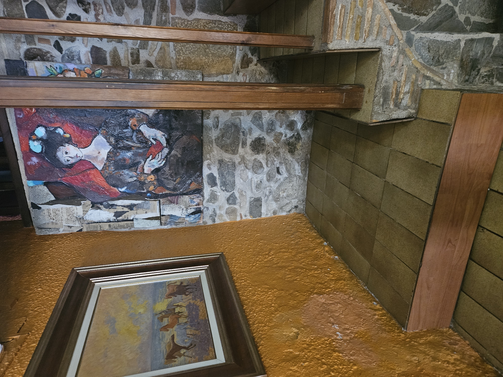 An interior scene in Mas Aliu, Spain, depicts a corner within a building featuring multiple wall textures and artworks. The left wall is textured, painted in a golden-orange hue, exhibiting some wear and minor paint peeling. Mounted on this wall is a framed rectangular painting, approximately 0.7 meters wide by 0.5 meters high, showcasing a landscape with several horses (brown, white, tan) near water under a yellowish sky. The frame is dark wood with a light inner mat. Adjacent to this, on the right wall, which is constructed from irregular grey and beige stone masonry with white mortar, a large, vertical mixed-media artwork is displayed. This artwork features a central figure of a woman with dark hair and light blue accents, dressed in a dark gown, holding a reddish object in her hands against a background of red paint and collaged paper fragments. The flooring in the foreground consists of beige, rectangular tiles. A single step, approximately 0.15 meters high, with a wooden front panel, separates this area from a slightly lower tiled section on the immediate right. Two dark brown wooden posts, roughly 0.1 meters thick, rise vertically, appearing to form part of a structural element or balustrade. The first post is positioned centrally, marking a transition to a lower level. The second post is further to the right, partially obscured. The area to the right of the wooden posts features a change in elevation, descending to another tiled floor area. This lower section is supported by a rough stone and brick base, consistent with the rustic masonry observed on the walls. No people are actively present; the only figures are within the depicted artworks. The environment suggests an indoor space, possibly a rustic home, restaurant, or gallery.