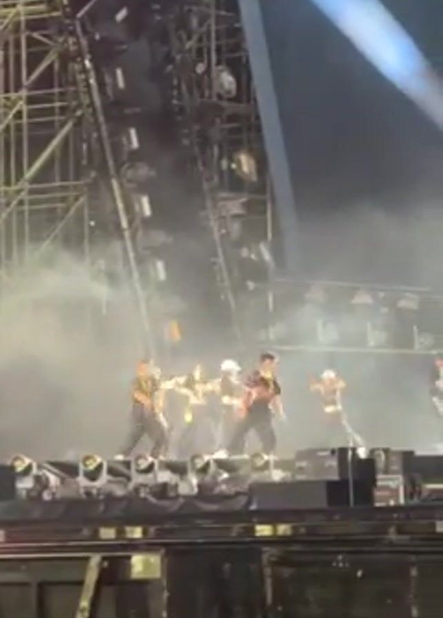 concert stage with multiple performers. The stage is surrounded by scaffolding and lighting equipment, with fog or smoke effects adding to the atmosphere. The performers are engaged in a choreographed dance routine, with synchronized movements and energetic gestures. The camera angle is low, looking up at the stage, suggesting the perspective of someone in the audience. The scene is brightly lit, with the lighting equipment casting beams of light across the stage and the performers.