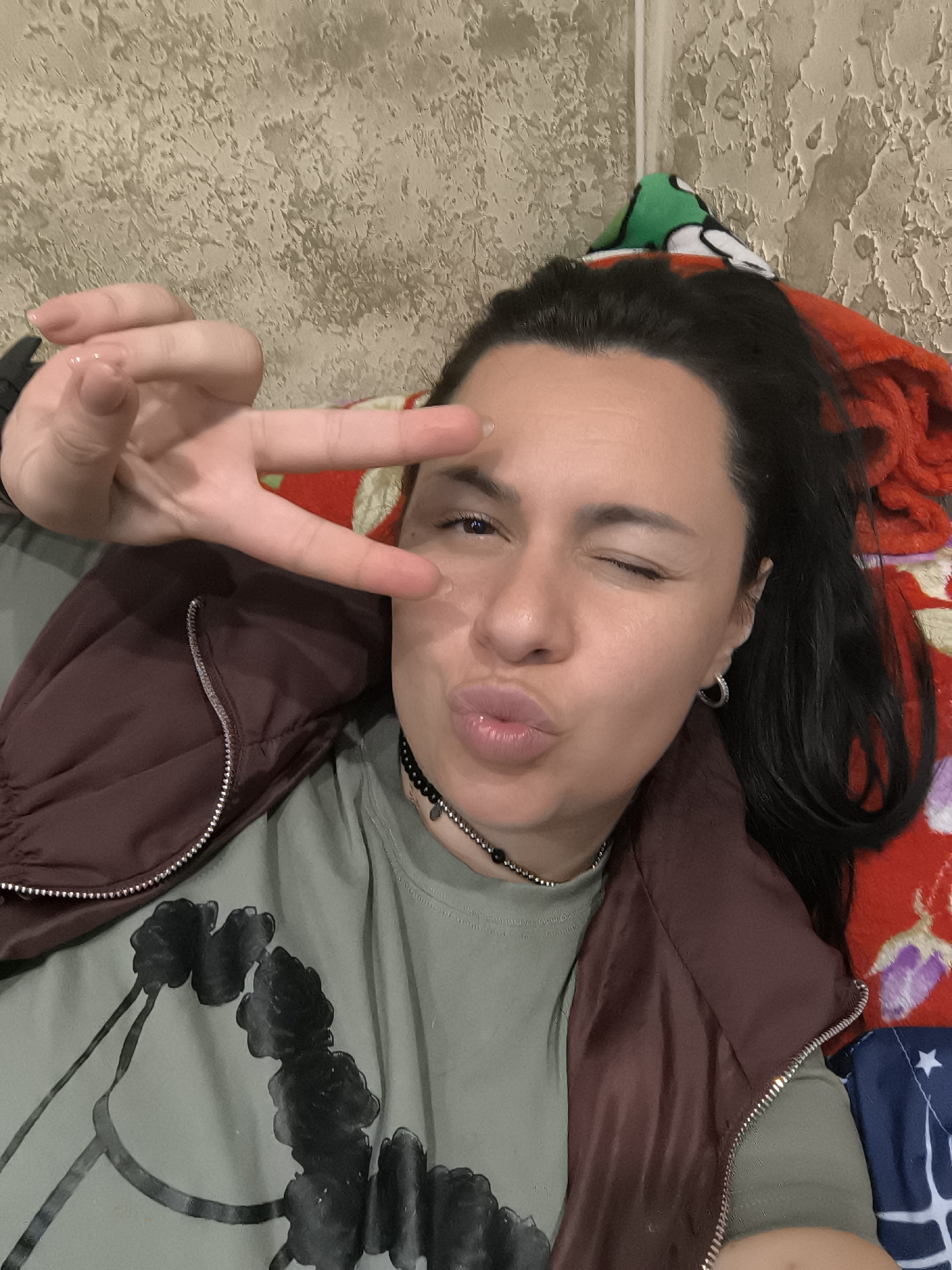 A woman is lying down and posing for a selfie. She is wearing a green t-shirt with a black design, a brown vest with silver zippers, and a black choker necklace. Her hair is dark and pulled back. She is making a peace sign with her left hand and winking with her right eye while puckering her lips. She is lying on a red and blue patterned blanket with a green object near her head. The background is a textured beige wall. The location cannot be determined from the image.