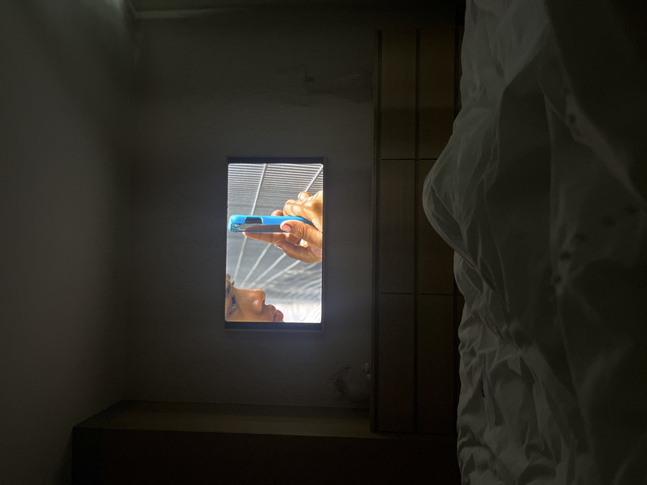 This image depicts a dimly lit interior scene, specifically a bedroom, located in Paris, France. In the immediate foreground, a bed is covered with rumpled white sheets and a duvet, forming a prominent mound suggesting the presence of an individual beneath the covers. Above a long, six-drawer wooden dresser or cabinet, a rectangular screen is mounted on the wall. The screen displays a brightly illuminated image: a close-up profile view of an individual with dark skin, facing towards the right side of the frame. Their right hand is prominently featured, holding a vibrant blue smartphone vertically, seemingly aimed at a light-colored metal grate or fence structure visible in the background of the screen's content. The screen of the phone itself is not visible. The room's ambient lighting is low, with the glowing screen serving as the primary light source, contrasting with the dark walls and furniture. A faint outline of a decorative object, possibly a small vase, is discernible on the left side of the dresser beneath the screen. A dark, vertical structure, possibly a wardrobe or wall corner, is visible on the far left.