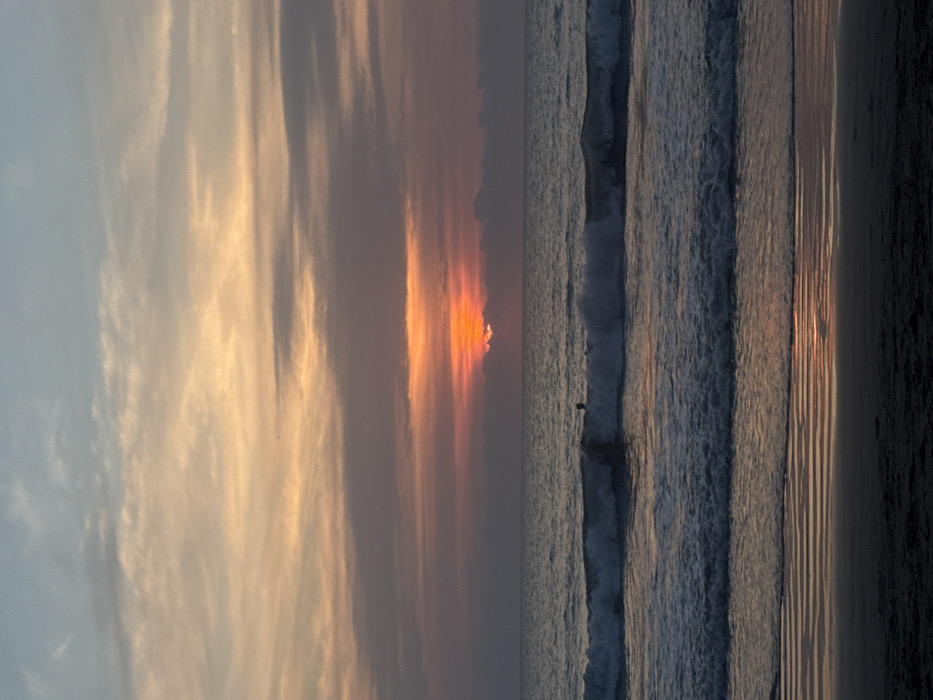 sunset at the beach. The sky is filled with clouds, and the sun is setting on the horizon. The colors of the sunset are reflected in the ocean. The waves are crashing on the shore, and the beach is sandy. A person is standing in the ocean looking at the sunset.