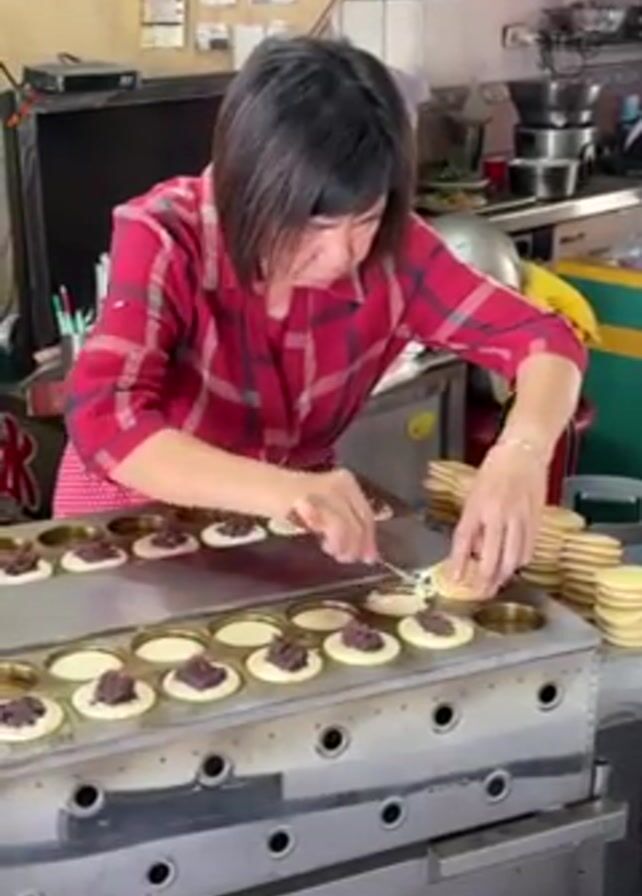 A middle-aged Asian woman in a red plaid shirt and a pink floral apron stands behind a metal cooking station. She is using a small spatula to smooth red bean paste into circular indentations in a flat, griddle-like surface. To her right, stacks of small, round pancakes sit ready. She picks up a pancake and places it on top of the red bean paste in one of the indentations. The cooking station has multiple circular molds, most of which have already been filled with a pancake and red bean filling. Behind her, the scene includes a TV, office supplies, and other kitchen equipment in a cluttered but functional space.