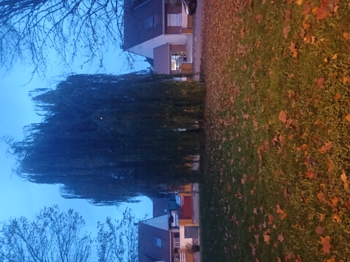 An outdoor scene shows houses and trees at dusk. A large, dark tree dominates the center, with branches reaching towards the ground. To the right, a lawn is covered with fallen leaves. In the background, houses with visible windows and roofs are partially obscured by the trees. The sky is a deep blue, indicating twilight. The lighting suggests the image was taken at either dawn or dusk.